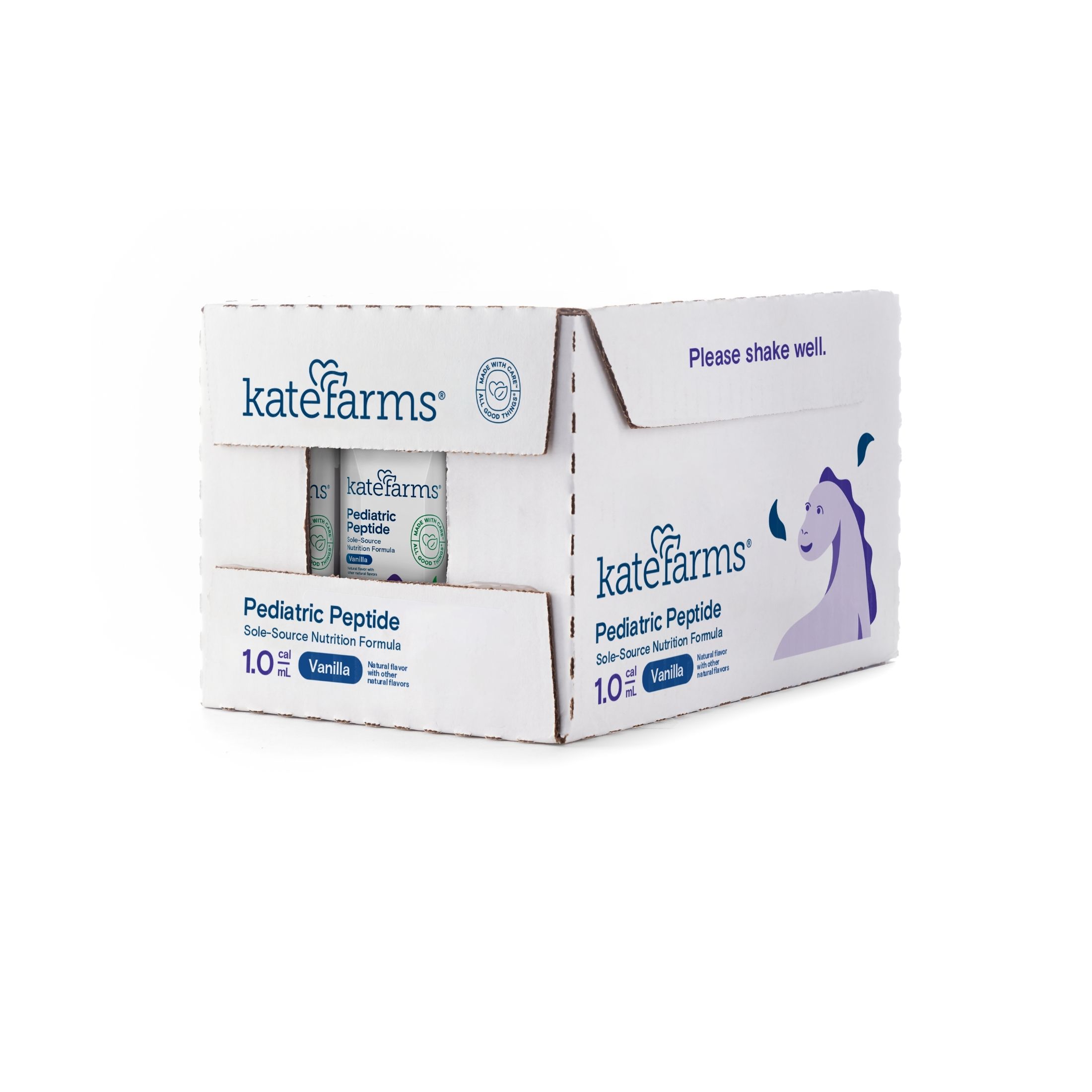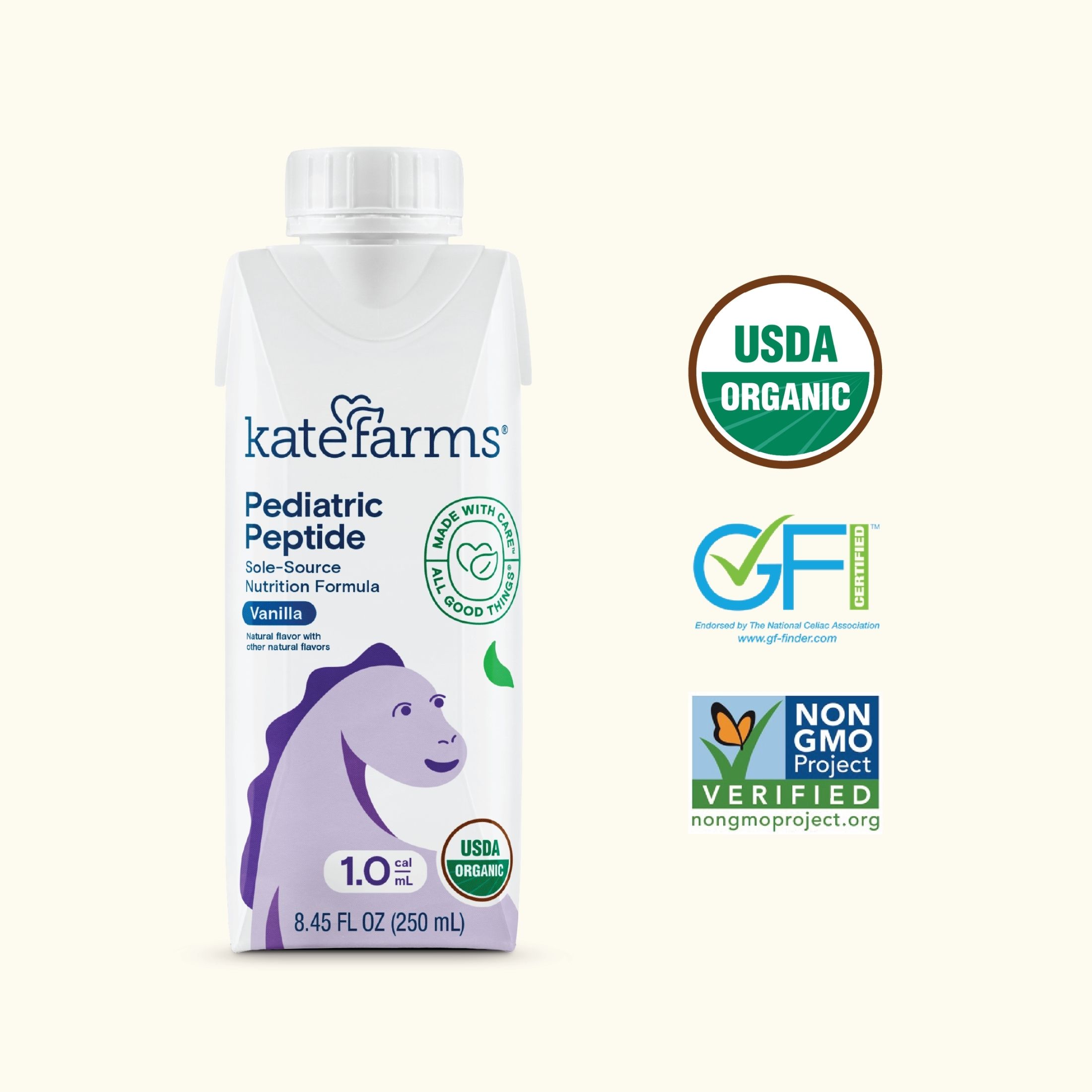 Don t compromise on quality nutrition Kate Farms Pediatric Peptide 1.0 is a complete nutrition pediatric tube feeding formula made for children ages 1 to 13 years who have trouble digesting. This organic plant-based peptide formula features hydrolyzed pea protein functional fats and corn-free carbohydrates to support weight gain and healthy development. Suitable for short or long-term tube feeding.