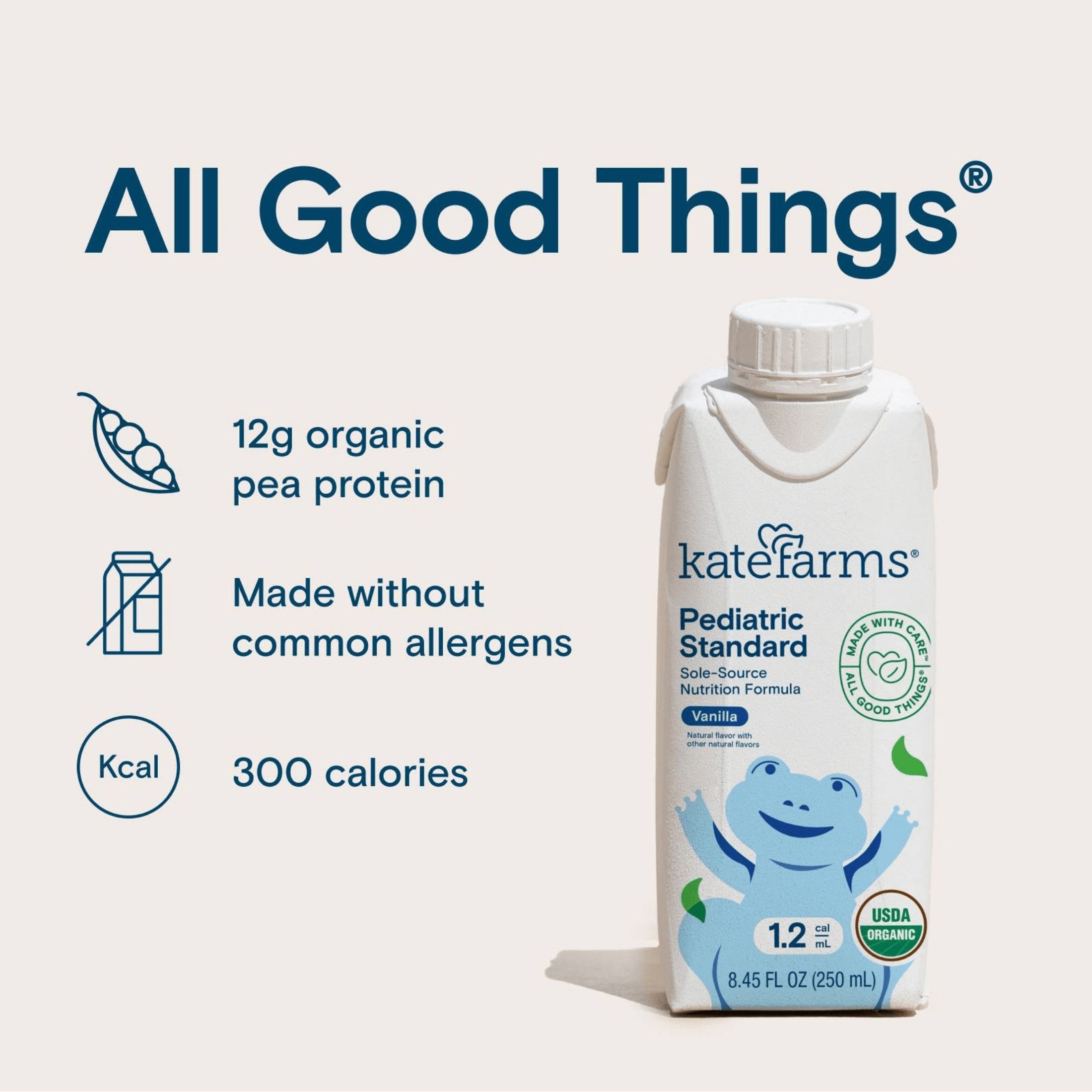Kate Farms Pediatric Standard 1.2 is a complete nutrition formula specifically made for kids ages 1 to 13 years with a range of medical or dietary needs. The great-tasting vanilla formula can be enjoyed for added nutrition and may also be used for enteral feeding. Designed for ease of digestion, Pediatric Standard 1.2 is made with organic pea protein, functional fats, and corn-free carbohydrates. Made without common allergens-dairy, soy, corn, gluten, or nuts-making them suitable for dairy-free, gluten-free, plant-based, and vegan diets. Plant-based protein with a complete amino acid profile. Each carton provides 12 grams of easily digested organic pea protein, especially for children with impaired digestion. Can be used to supplement a regular diet or as enteral nutrition. Meets or exceeds 100 of micronutrients. Provides MCT from organic coconut oil and prebiotic fiber to promote easier digestion.