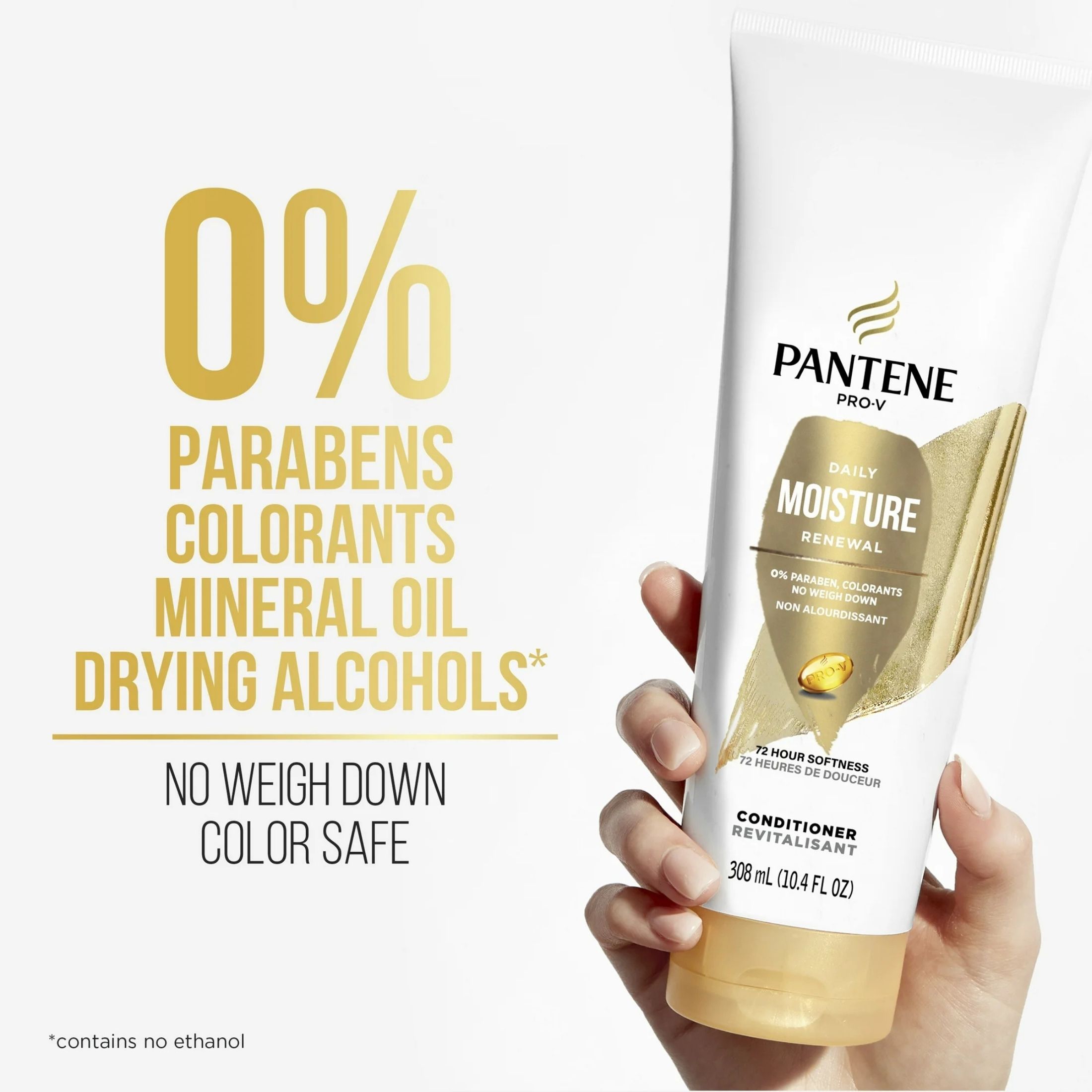 HARD WORKING, LONG LASTING Your haircare should work as hard as you do. Pantene Pro-V Daily Moisture Renewal Conditioner visibly replenishes dry hair for softness and hydration. This formula contains 2x more nutrients for 72+ hours of softness. This moisturizing conditioner is color-safe and crafted with protective anti-oxidants, strengthening lipids, and pH balancers for rich hair hydration, leaving you with strong and healthy strands. With Pantene Pro-V Daily Moisture Renewal Conditioner, say goodbye to dry locks and unleash soft, hydrated hair that looks and feels beautiful for longer. 2X MORE NUTRIENTS, LASTS FOR 72+ HOURS This Pantene Pro-V Conditioner is designed to be used with our complete Moisture Renewal Collection has 2x more nutrients to infuse your hair with optimal hydration. These powerful Moisture Renewal formulas work together to permeate every strand, fighting damage where it starts and hydrating hair from the inside out for results that last 72+ hours without washing. These formulas are crafted with Pro-V nutrients, protective anti-oxidants, Pro-Vitamin B5, and pH balancers, and made without parabens or colorants. TO USE Massage Pro-V Daily Moisture Renewal Conditioner into your cleansed, damp hair, making sure to pay special attention to your ends. Rinse thoroughly. For best results use with Pantene Pro-V Daily Moisture Renewal Shampoo. This color-safe hair moisturizer is gentle enough for everyday use on chemically-treated hair or color-treated hair, and gives you results that last for 72+ hours without washing.